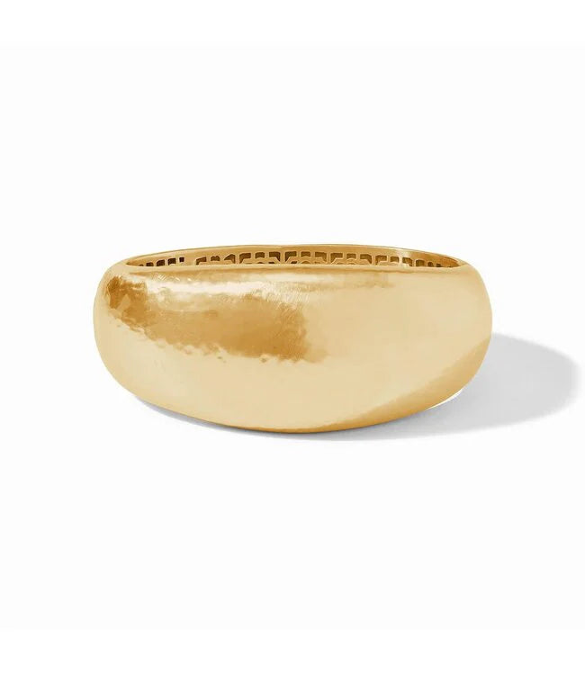 A wide, gracefully tapering bangle with a rounded profile and hand-hammered finish, featuring an opulent geometric piercework interior.