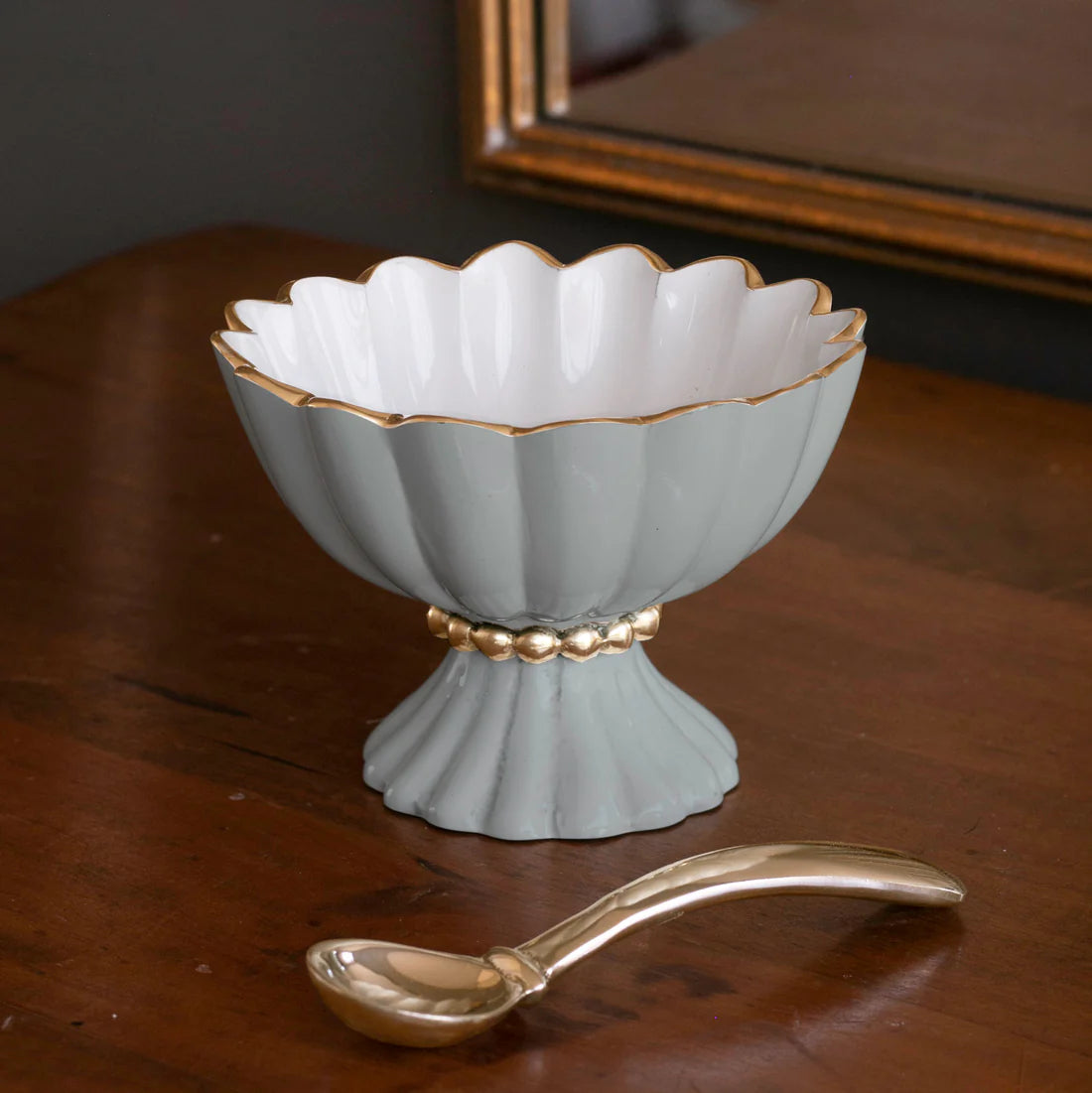 Beautifully fluted surfaces and gold pearl details are classic design elements that make this piece a reflection of the past, but relevant and appealing for today. Perched atop a gorgeous base, the mini pedestal bowl with gold spoon has a sensuous feel that proves that the small things make all the difference. Ideal for serving your favorite dips, sauces and salsas.