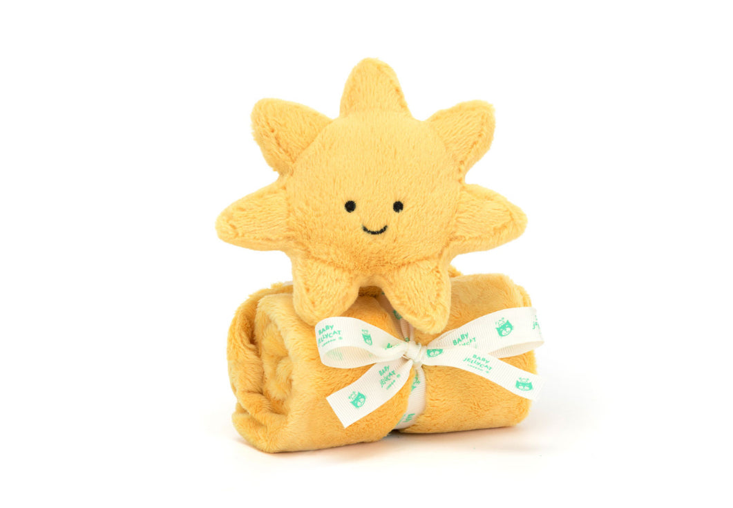 The Amuseables Sun Soother is a bundle of warm cuddles, rolled up and presented in a Baby Jellycat grosgrain ribbon. Both golden sun and soother are made with the softest recycled fibres. With cheery embroidered eyes and smile to brighten every day, it makes for a perfect newborn gift.
