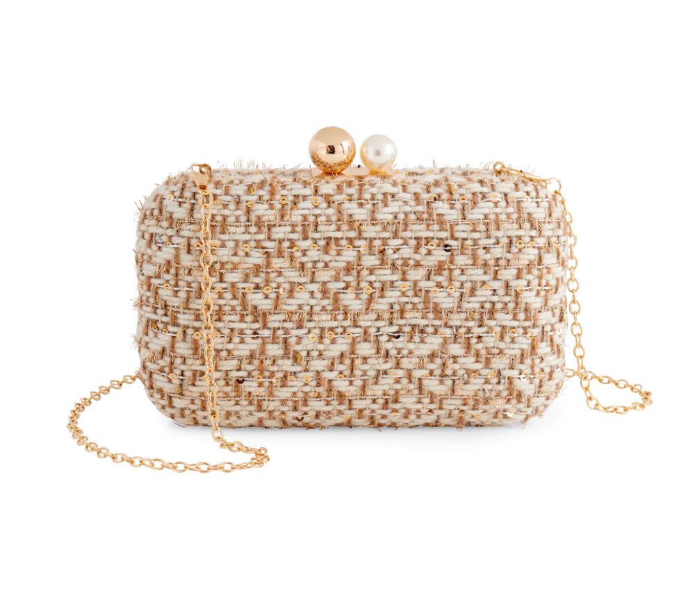The Mabel Minaudière is your new secret weapon for instant glam. Wrapped in textured tweed and topped with a gleaming gold and pearl clasp, this structured clutch adds just the right amount of sparkle to any outfit. It’s compact enough to keep things classy but roomy enough to stash your night-out essentials. With a detachable gold chain strap, you can swing it crossbody or carry it as a clutch—it’s a total show-stealer either way.