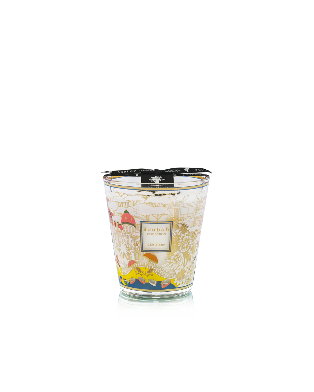 The screen-printed decor for the Côte d’Azur candle was inspired by some of the elements in Thierry Larcher’s design, such as the Negresco and the legendary Promenade des Anglais. We wanted to go a step further by incorporating architectural elements from the town of Menton and the town of Saint-Tropez. In the hinterland, you can imagine forests of umbrella pines and dream of visiting the Maeght Foundation in the heights of Saint-Paul-de-Vence.